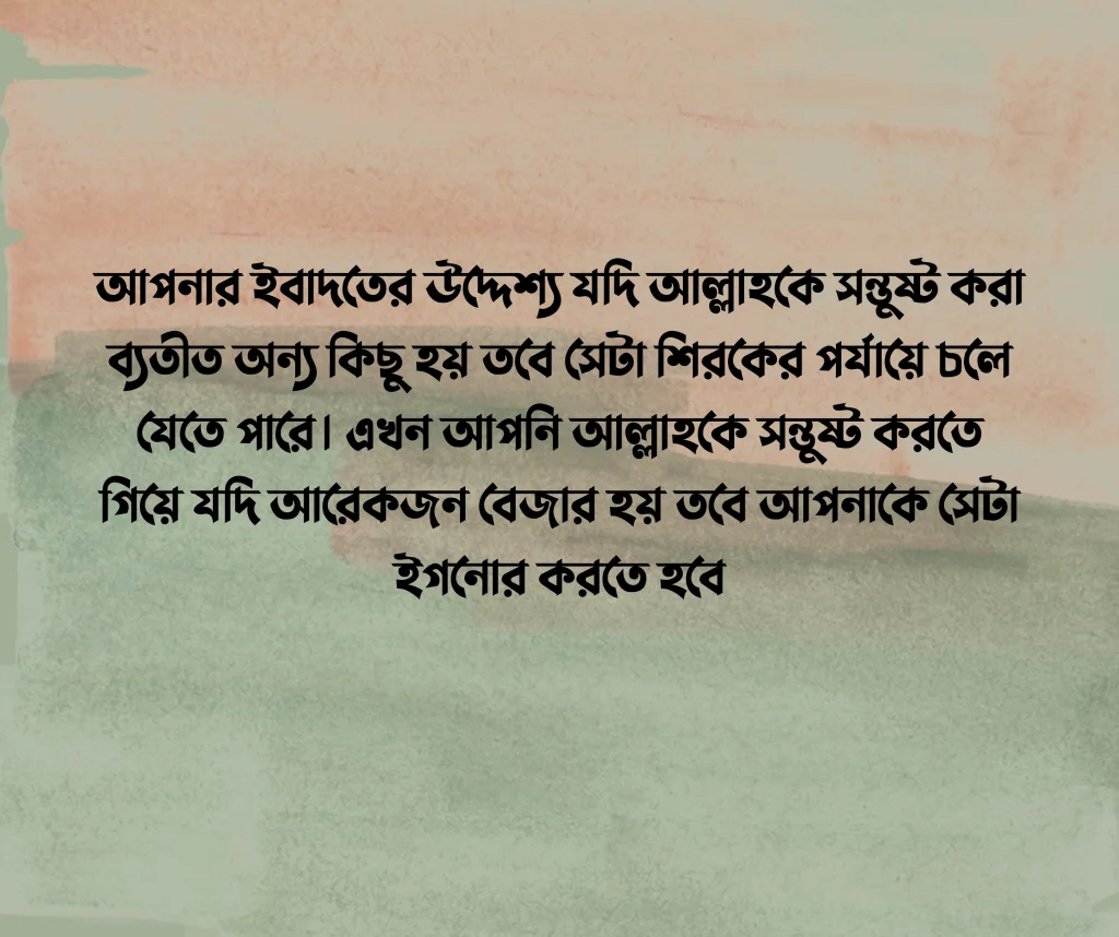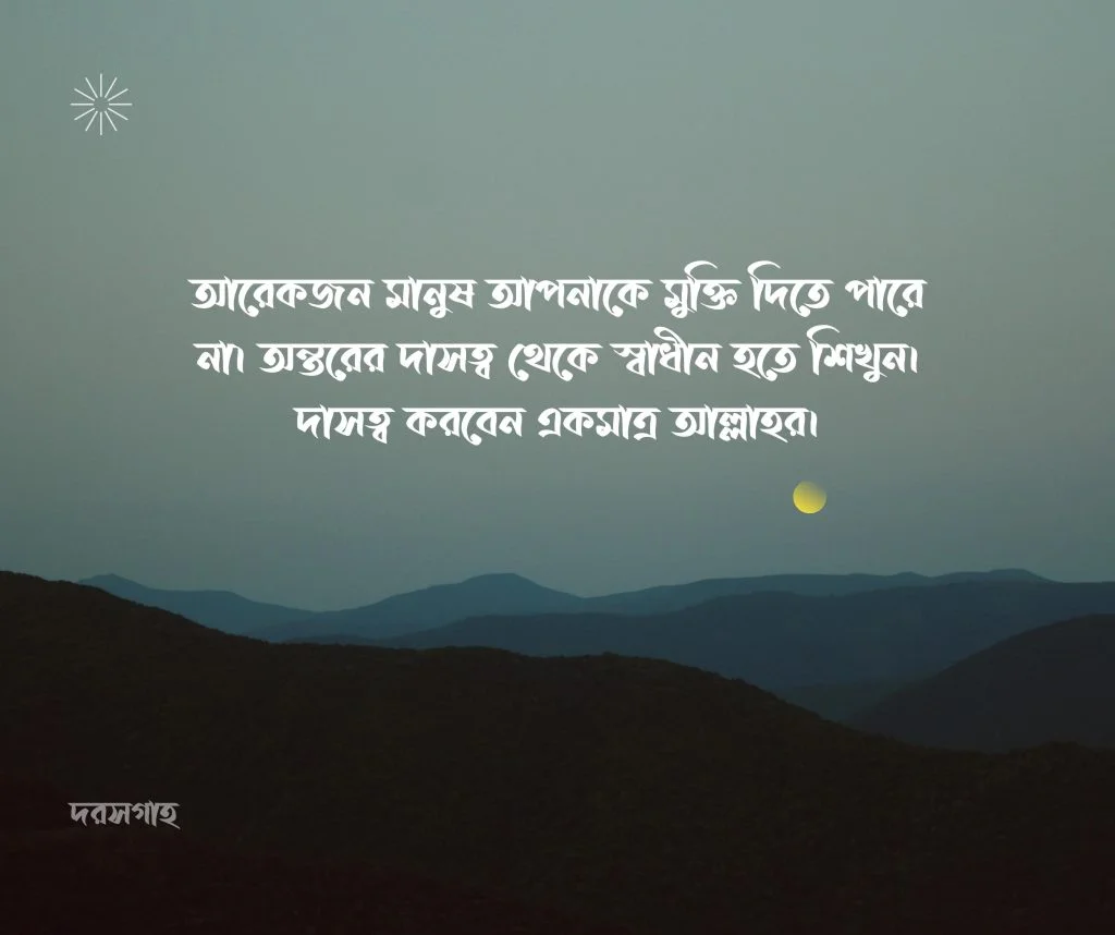 আপনি দাড়ি রাখুন একমাত্র আল্লাহকে খুশি করার জন্য। আপনি হিজাব পড়ুন সেই রব কে সন্তুষ্ট করার জন্য। আপনি হারাম কে পরিত্যাগ করুন সেই আল্লাহর কাছে ক্ষমা লাভের আশায় যিনি বিচার দিবসের মালিক। আরেকজন মানুষ আপনাকে মুক্তি দিতে পারে না। অন্তরের দাসত্ব থেকে স্বাধীন হতে শিখুন। দাসত্ব করবেন একমাত্র আল্লাহর। নিজের নফস কিংবা আরেকজন মানুষের দাসত্ব কখনোই কাম্য নয়।